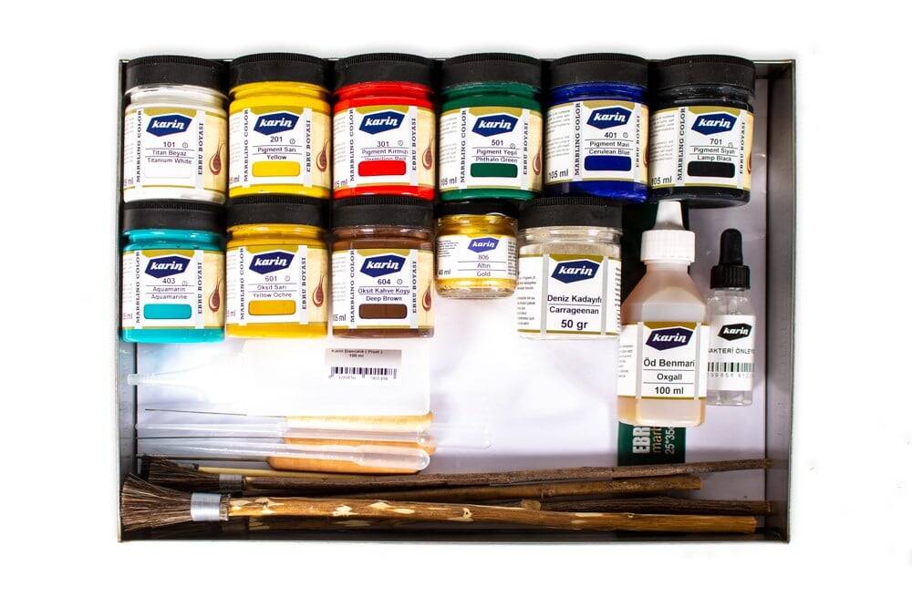 Karin Profesyonel Ebru Seti 25 x 35 cm Profesyonel Ebru Seti içindekiler: 10 Farklı renk ezilmiş ebru boyası; Bakteri önleyici 1 şişe; Suluk orta boy 1 Adet; Ebru kağıdı 100 adet; Deniz kadayıfı 50 gr; At kılı battal fırça 2 adet; At kılı serpme fırça 2 adet; At kılı karıştırma fırça 2 adet; Sığır ödü ; 3'lü Biz takımı; Tarak 35 cm 1 adet; Piset 4 adet. Çelik Ebru Teknesi; Karin Geleneksel Ebru seti profesyonel ebru çalışmalarınız için ihtiyacınız olan tüm ürünleri içerisinde bulundurur. Ebru seti ezilmiş ebru boyaları, kitre hazırlayabilmeniz için en kaliteli deniz kadayıfını, geleneksel at kılı ve gül dalından imal edilmiş fırçaları, desen yapabilmeniz için biz ve tarakları, boyaların ayarını yapabilmeniz için öd, suluk ve pipetleri, kağıtları ve kitrenin uzun ömürlü olması için bakteri önleyici içerir. Karin ebru boyaları yüksek pigment oranı kullanılarak ve ezilerek hazırlanmıştır. Renkler oldukça canlıdır ve zemin, battal çiçek ebrularını çok iyi neticeler elde ederek hazırlayabilirsiniz. Kitre hazırlanmak için set içeriğinde bulunan deniz kadayıfı kitrenin hem uzun süreli kullanılabilmesini hem de renklerin kağıtta daha net gözükmesini sağlar.