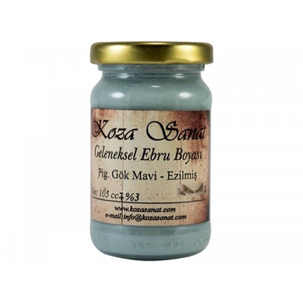 Koza Ezilmiş Ebru Boyası 105 ml Pigment Gök Mavi Bu ürün öd ve su ayarına imkan vere bir kıvama sahiptir. Karışım renk olmayıp saf pigmentlerden elde edilen bu ürünün pigmentleri yüksektir. Kimyasal katkı maddesi içermez, solmaya ve renk kaybına karşı dirençli bir yapısı vardır. Ebru Boyası su bazlı bir boyadır. Ebru sanatında doğal ve yüksek pigmentasyona sahip boya kullanmak ortaya çıkacak sanat eserinin kalitesi açısından oldukça önemlidir. Geleneksel ebruda toprak boyalar adı verilen doğadaki kayalar ve topraktan elde edilen tabii boyalar kullanılır. Ebru boyasının canlılığı ve kalıcılığı ebru desenlerinin kağıt üzerinde parlak ve şık görünmesini sağlar.