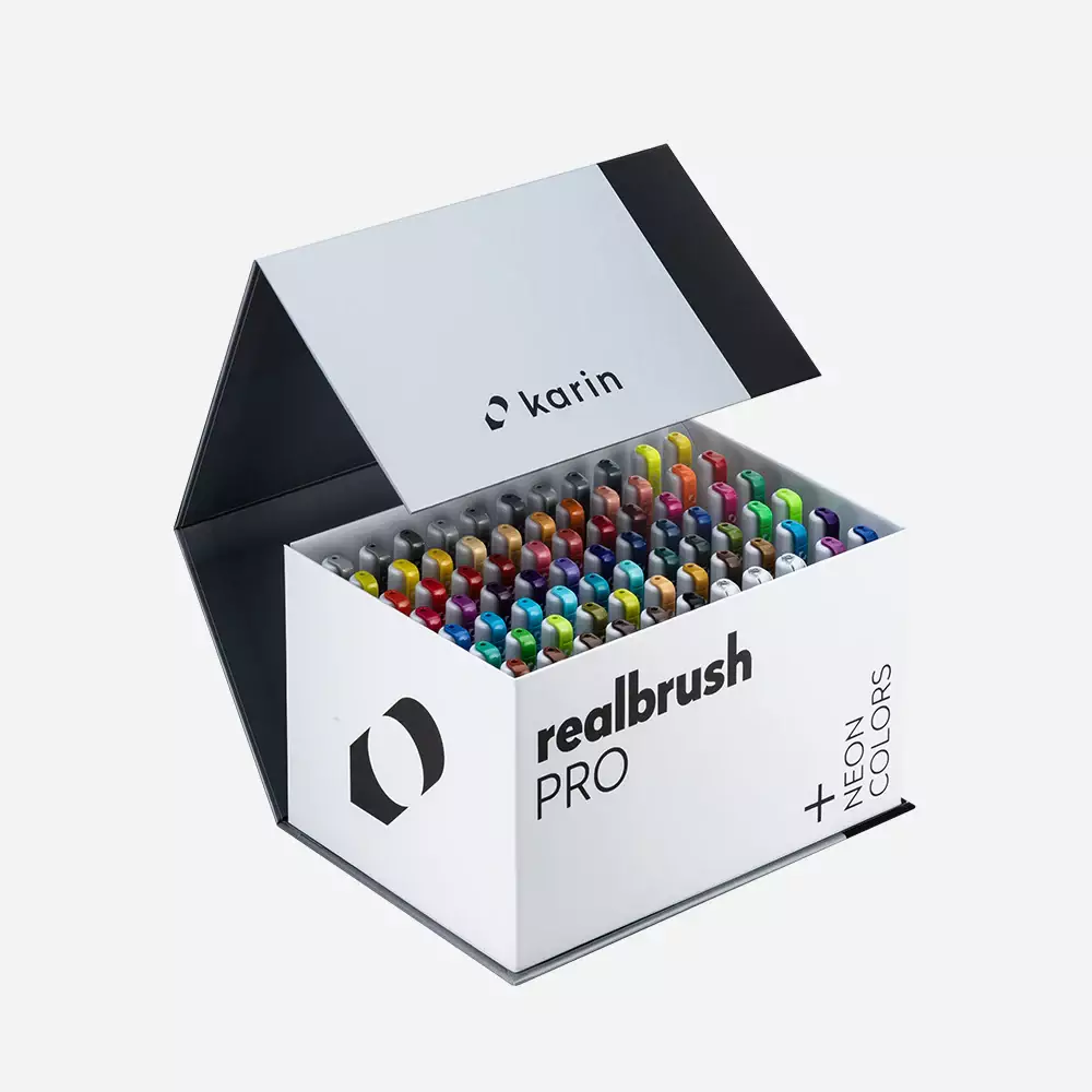 Karin Realbrush PRO markerlerin her biri 2,4 ml su bazlı boya içerir. Karin kalemlerinde kullanılan "sıvı mürekkep" teknolojisi sayesinde, mürekkep son damlasına kadar kalitesi ve canlılığı korunur. Geleneksel filtreli kalemlere göre iki kat daha verimlidirler. Ayrıca, Japon gerçek fırça ucu ile donatılmıştır. Yoğun boya bazlı renkler içeren toksik olmayan boyalar içerirler. Renkler karıştırılabilir ve açılabilir, iki kalem ucunun uçlarını birbirine değdirerek ton geçişleri elde edilebilir. Dikey olarak saklayın.