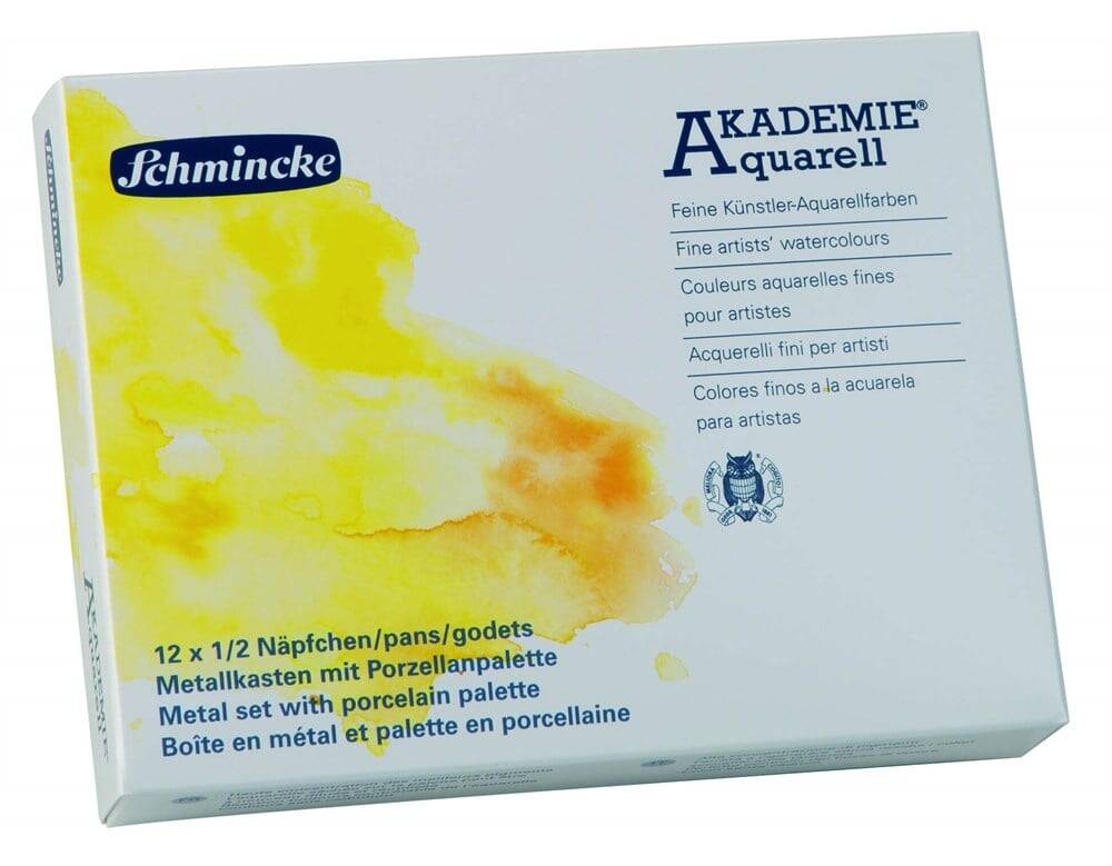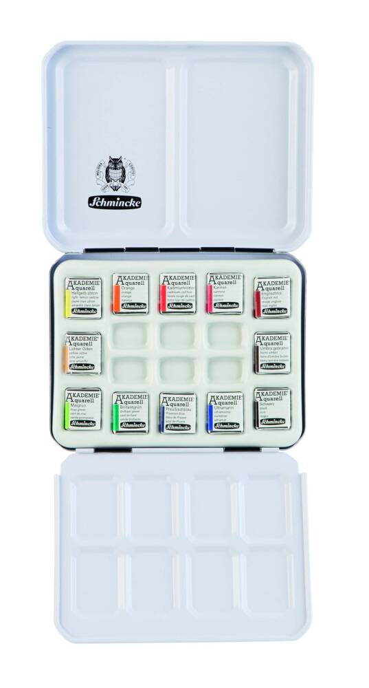 Schmincke Akademie Aquarell Metal Box Porcelain Palette Watercolor Set 12 x Half Pan 75749