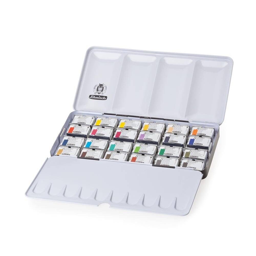 24 adet yarım tablet, iki defa sıvı-doldurma sistemiyle doldurulmuş yüksek ışık dayanıklılığına sahip farklı renk. En verimli karışım sonuçlarını elde etmek için 16 adet tek pigmentten oluşan saf renk. Palette kurumuş olsa dahi, tamamiyle tekrar kullanılabilme özelliği. Akademi serisi estetik bir görünüme sahip, farklı sayıda boya çeşidinden oluşan, yarım ya da tam tablet, plastik ve metal setler olarak da sunulmaktadır. Akademi Aquarell suluboyalar kadmium içermez. Akademi serisinin ana renklerden oluşan temel suluboya setleri, resim öğrencilerinin ihtiyaçlarına uygun bir şekilde dizayn edilmiştir. Bu setler 24 farklı, çoğunluğu en yüksek ışık dayanıklılığına (4 ya da 5 yıldız) ve oldukça yüksek pigment yoğunluğuna sahip sulu boyalardan oluşur. Yüksek kalite artist pigmentler ve doğal Arap zamkı bağlayıcıdan oluşan bu boyalar ile elde edeceğiniz karışımların parlaklığı ve canlılığı, yumuşak suluboya kağıtları üzerinde dahi garanti sonuçlar verir. 10, 12 ve 24 tabletlik farklı setler mevcuttur. Akademi serisi suluboyalar, Schmincke Horadam serisi suluboyalar ve Shmincke Aqua suluboya yardımcıları ile karıştırılarak yaratıcı suluboya eserlerine imkan sağlar. Daha iyi sonuçlar elde etmek için en az 240 gramlık suluboya kağıtları üzerine uygulama yapılmalıdır.